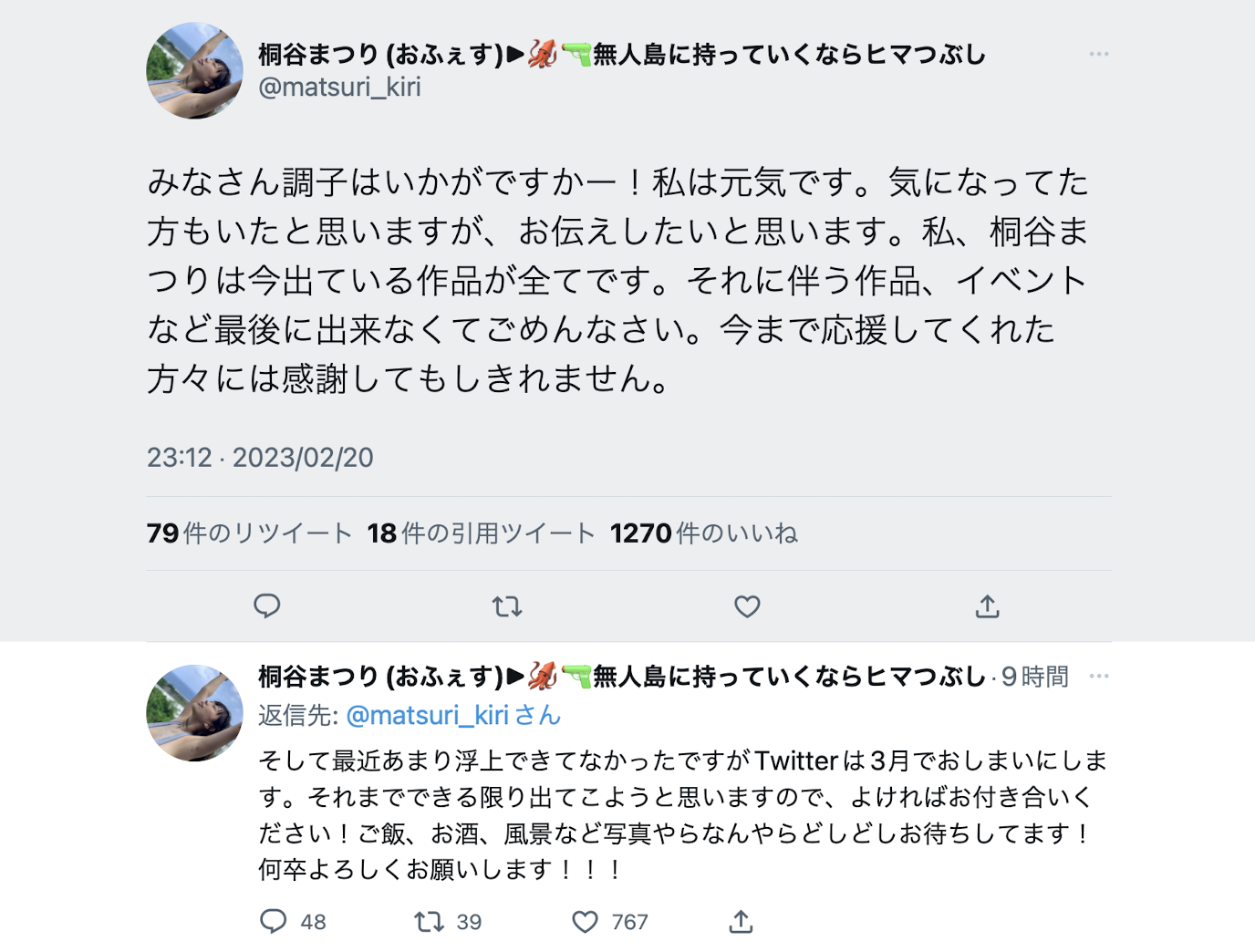 意思就是说,桐谷まつり(桐谷茉莉)要结束twitter了!