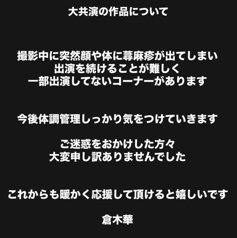 所以真相大白了,不是片商忘了把她演出的片段剪进去,而是她因为荨麻疹发作所以无法全程参与演出ー至于荨麻疹发作有多痛苦呢?仓木华是引用之前的发文,她说先是身体感到搔痒,接着视线也开始模糊,随后脸部剧烈的疼痛,根本拍不下去⋯