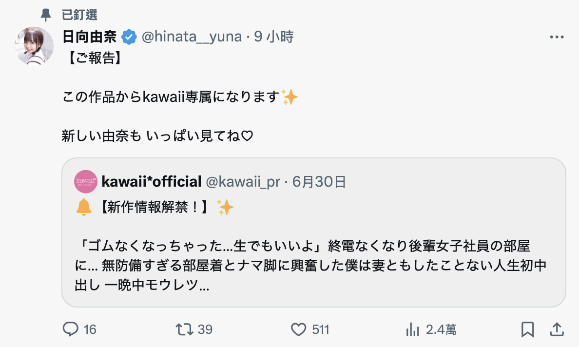 一样也是中出し解禁,不过日向由奈的身分不像黒岛玲衣那样扑朔迷离,不只封面被标明「移籍第一弾」、日向由奈也在自己的X(https://x.com/hinata__yuna)直接说了,从这支作品开始她就是可爱社(kawaii*)的专属女优,不用怀疑〜
