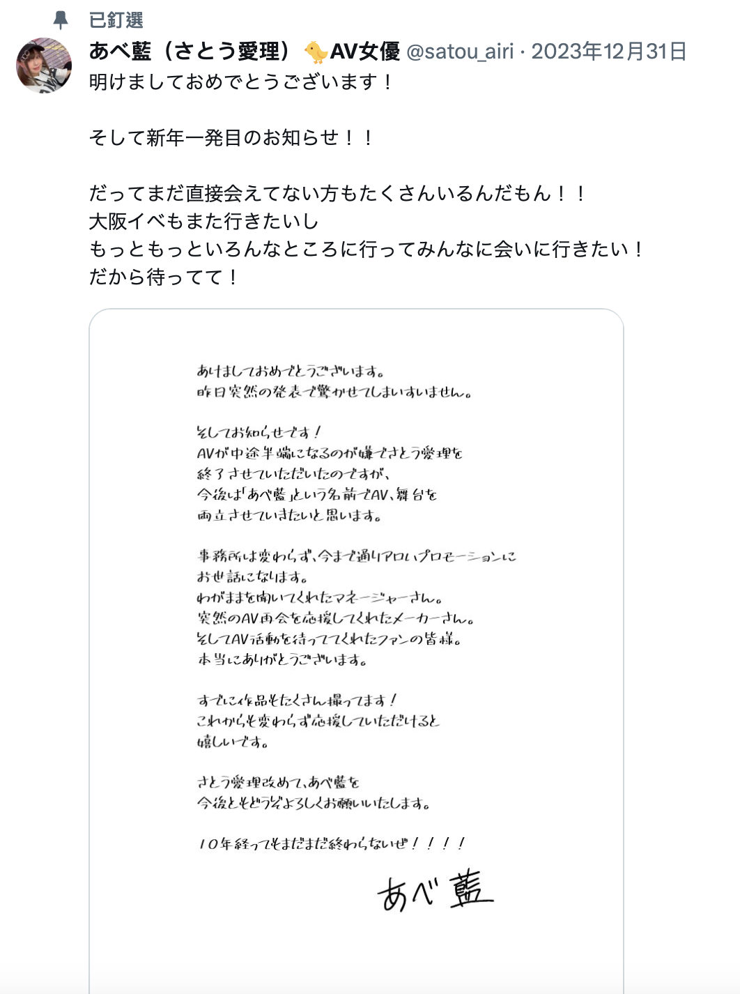 虽然有人说朝令有错夕改又何妨,不过さとう爱理(佐藤爱理)真的是装肖仔,所以我的第一个想法是她该不会是用引退的手段换事务所吧?结果她又说了,自己并没有更换事务所,仍然是ALOHA Promotion的人;而换了名字后她仍然是AV和舞台剧并行⋯