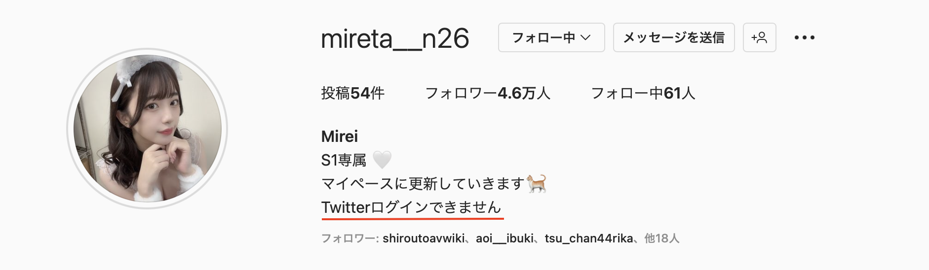 twitter无法登入不是东云みれい(东云美玲)的错,但IG上的变化她却没有解释,她原先是帐号是「http://instagram.com/mirei__shinonome」、登录的名字是东云みれい(东云美玲),现在变成了「https://www.instagram.com/mireta__n26/」,名字则是Mirei(就是みれい的读音):