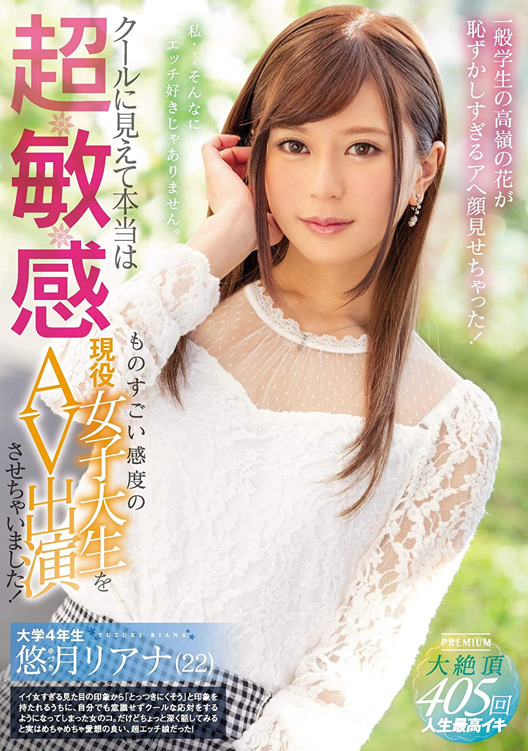 她的第一支作品是在片商Premium发行的「クールに见えて本当は超敏感ものすごい感度の现役女子大生をAV出演させちゃいました!」,当时的设定是看起来像个酷酷的女大学生其实超敏感,有多敏感呢?就是ー
