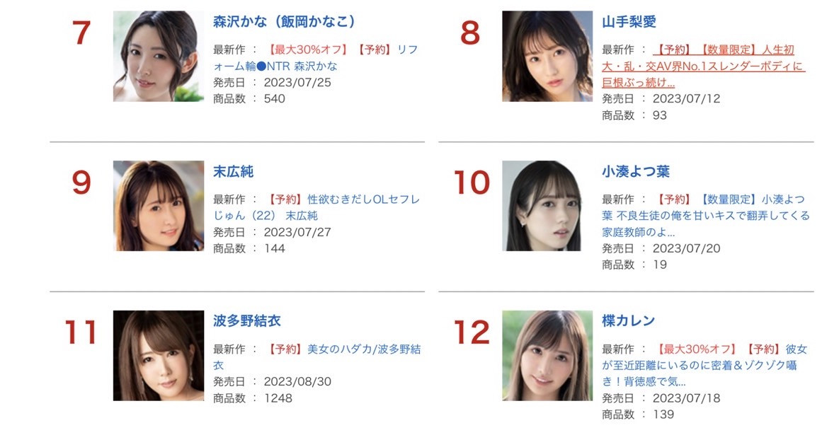 「末広纯(末广纯)」。当然啦,森沢かな(森泽佳奈)也一直是稳定强,但近期的爆发力还是末広纯比较强一点,所以这一篇就让我们聚焦在她身上:前几天在介绍広末凉子明星脸的时候我就有提到这位女优,虽然她之所以姓「未広」就是因为大家觉得他有够像広末凉子所以才颠倒了人家的姓氏取艺名,不过大多数的人似乎都觉得不像—但也没关系,末広纯不需要恶搞广末凉子就很红,销售的名次就放在那里,连续两个月都在FANZA累积销售的月间AV女优排行榜打进前十名,作品更是发得到处都是,想看不到都不行⋯