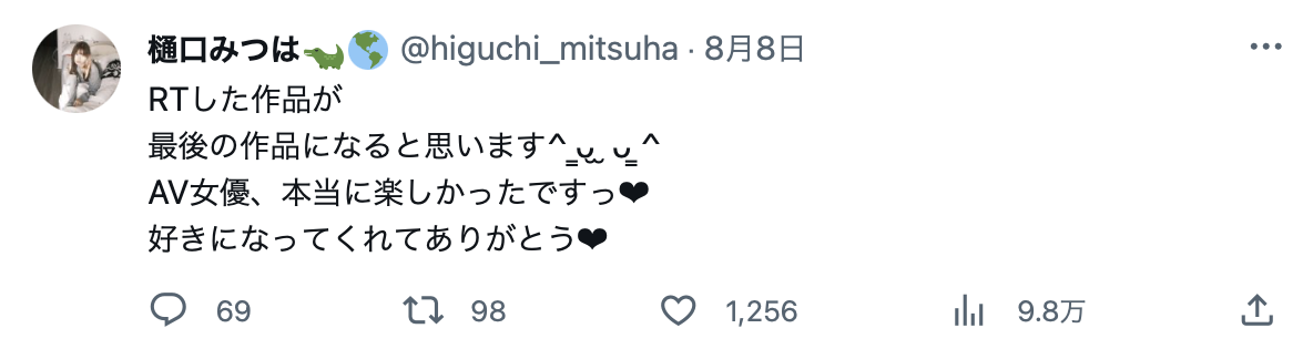 事务所对此的解决之道就是「去找其他事情给女优做」,可能是去陪酒、可能是摄影会也可能是脱衣舞,这些都不是能延长AV生涯的差事,却可以让女优继续有事做ー所以在告诉大家自己的AV生涯已经画下句点的同时,出道时曾被片商说是有13万追踪的樋口みつは(樋口三叶)twitter的自我介栏也有了改变ー