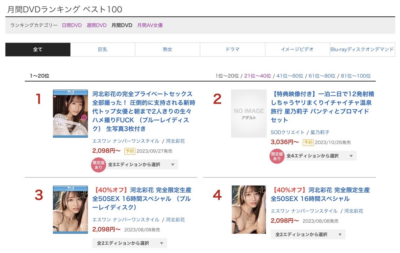 与贞松大辅合作的私密性交企划「河北彩花の完全プライベートセックス全部撮った! 圧倒的に支持される新时代トップ女优と朝まで2人きりの生々ハメ撮りFUCK 」毫无悬念拿下第一,更恐怖的是她的精选辑分别拿下第三第四(第3名是蓝光版,第4名是DVD版),虽然前几个月被三上悠亜的引退企划压制,但现在没了三上,河北彩花就是无解的存在〜