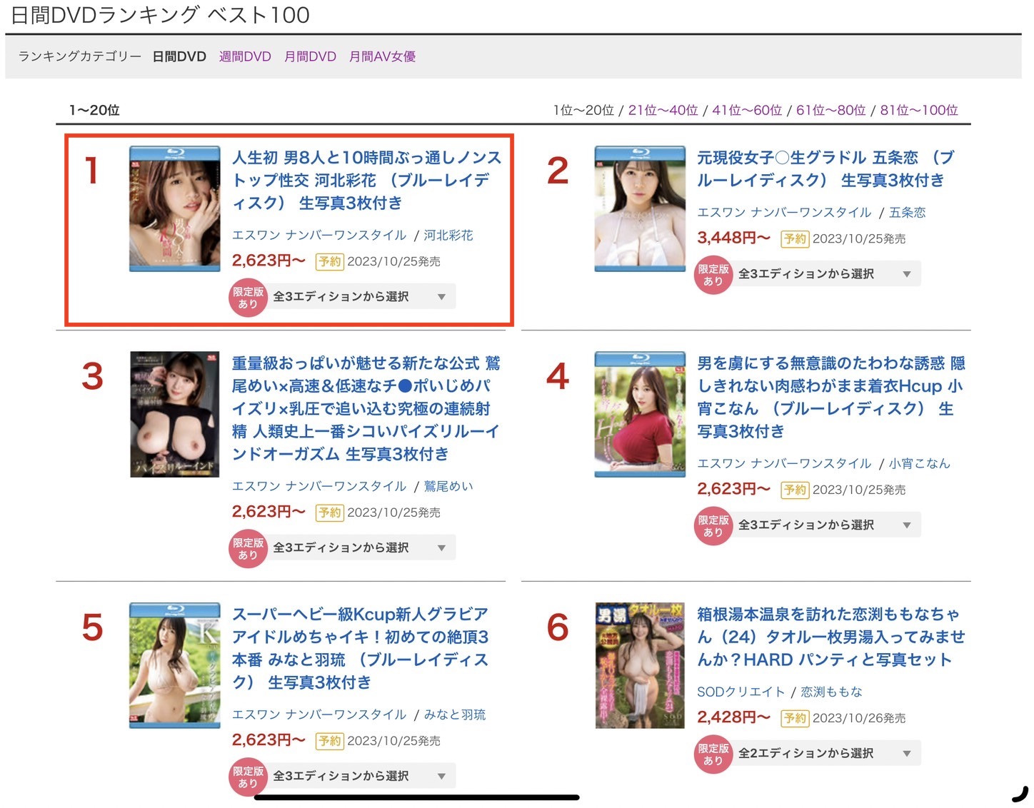 因为标题取得狠辣再加上她是河北彩花,所以她又拿下了今天的销售排行榜冠军,从第2到第5有强力新秀有资深战将还有社群强者,而且她们清一色地都是奶子很大的肉弹型女优就知道河北有多厉害ー所以我的想法还是一样,虽然群雄并起,但要在后三上时代要成为业界第一不外乎人气、买气或两者兼具地领先其他女优,身为销售遥遥领先的冠军,河北彩花已经有了绝对优势,再加把劲多一点活动然后找个有着精准投资眼光的经纪人,她就是接下来的AV天后〜
