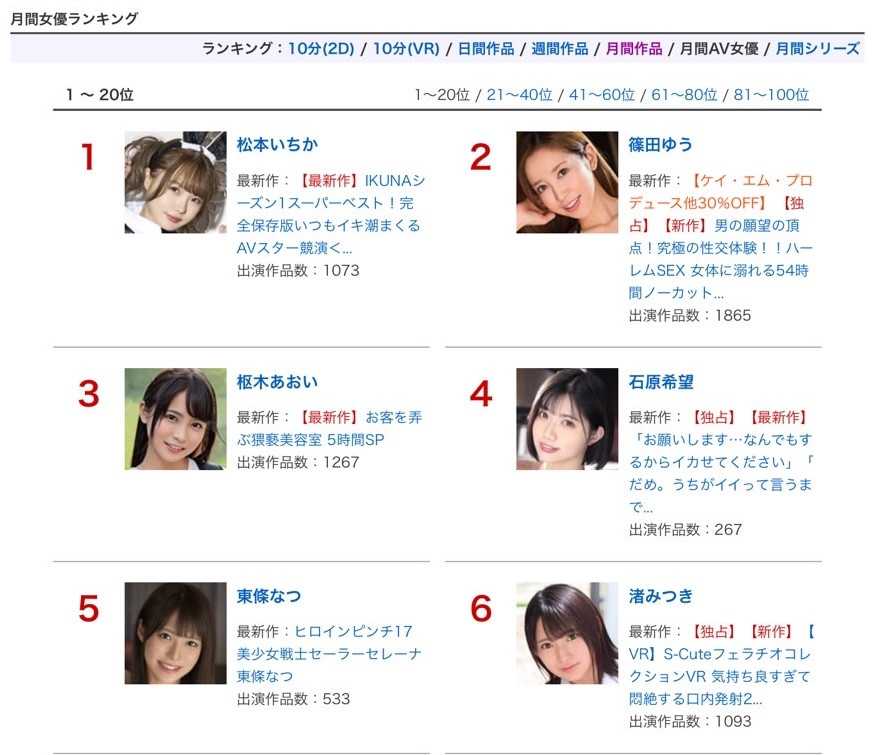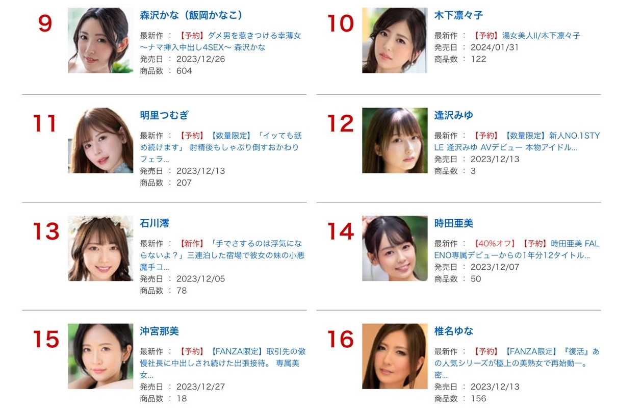 第三名的一亿円Body「百田光希」、第五名的最后大魔王「苍乃美月」、第七名偶像资历8年的「逢沢みゆ(逢泽美优)」、第八名性爱天才的「绫瀬天」、第11名比AI还强的好身材「泷本雫叶」⋯从这边你就知道上个月登场的新人有多厉害,为什么片商每个月都要推出新人?为什么事务所一直在征才?就是因为她们真的卖!