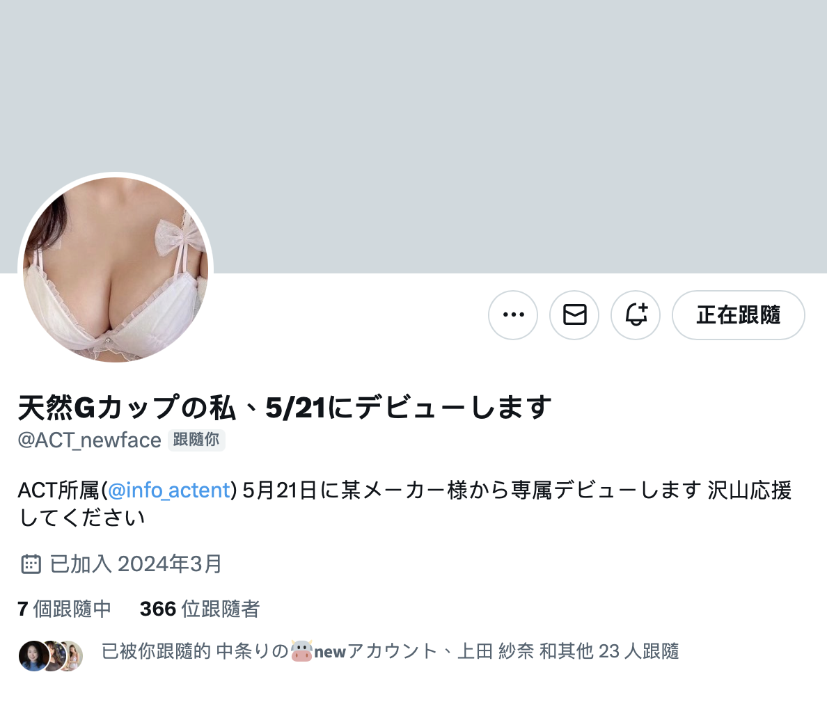 而她的出现也解开了之前的谜团,因为她就是笔者之前预告的那位「天然Gカップの私、5/21にデビューします」(天然G罩杯的我,将在5月21日出道),在正式出道后,目前她已经修改了X的ID(https://twitter.com/naminami_act),准备大干一场惹〜