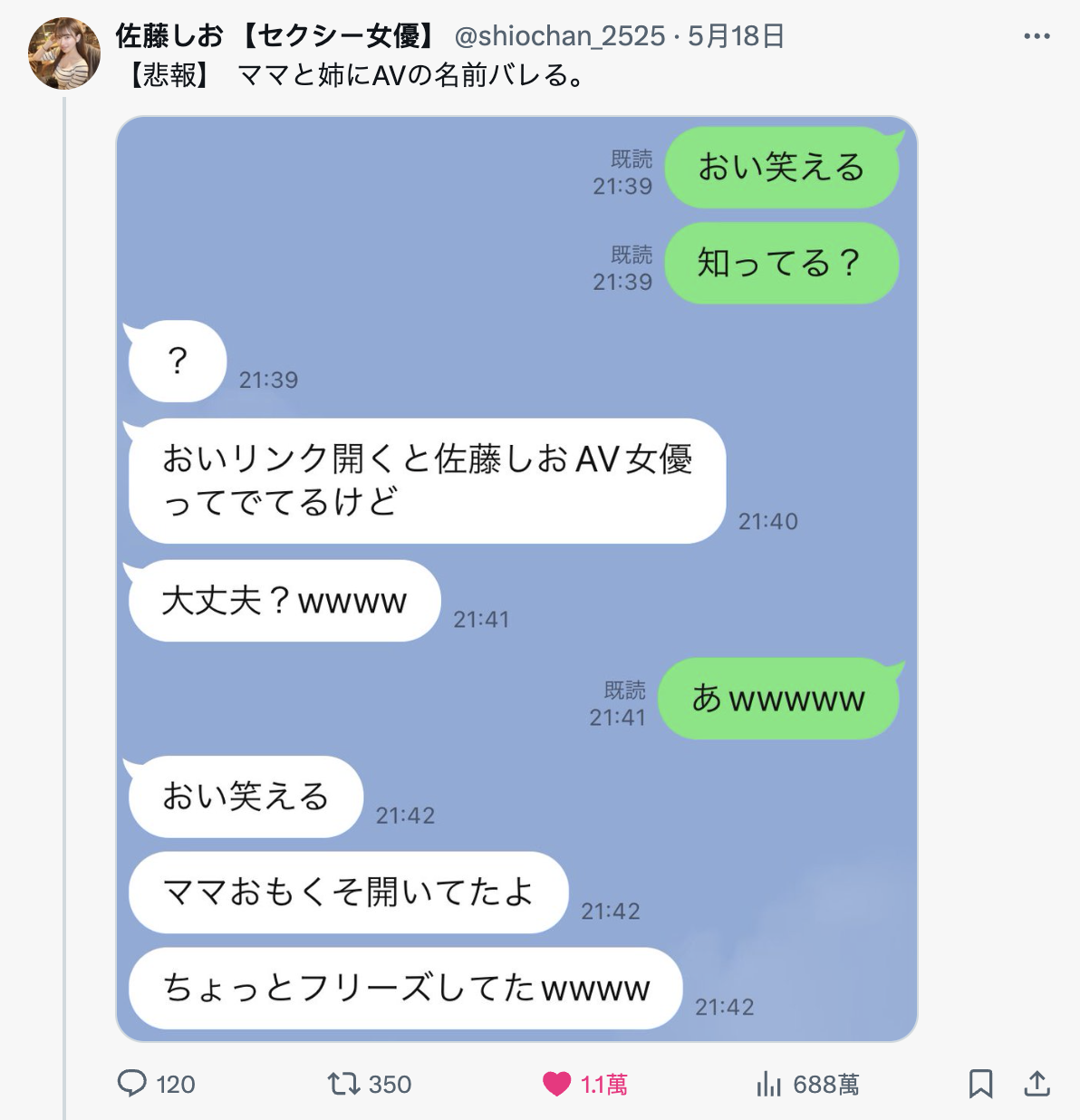 经纪公司ACT所属的企划女优「佐藤しお(佐藤汐)」是在自己的X(https://x.com/shiochan_2525)贴出Line的对话,姊姊是直球对决地说打开了某个抖音的连结有个名叫佐藤しお(佐藤汐)的AV女优: