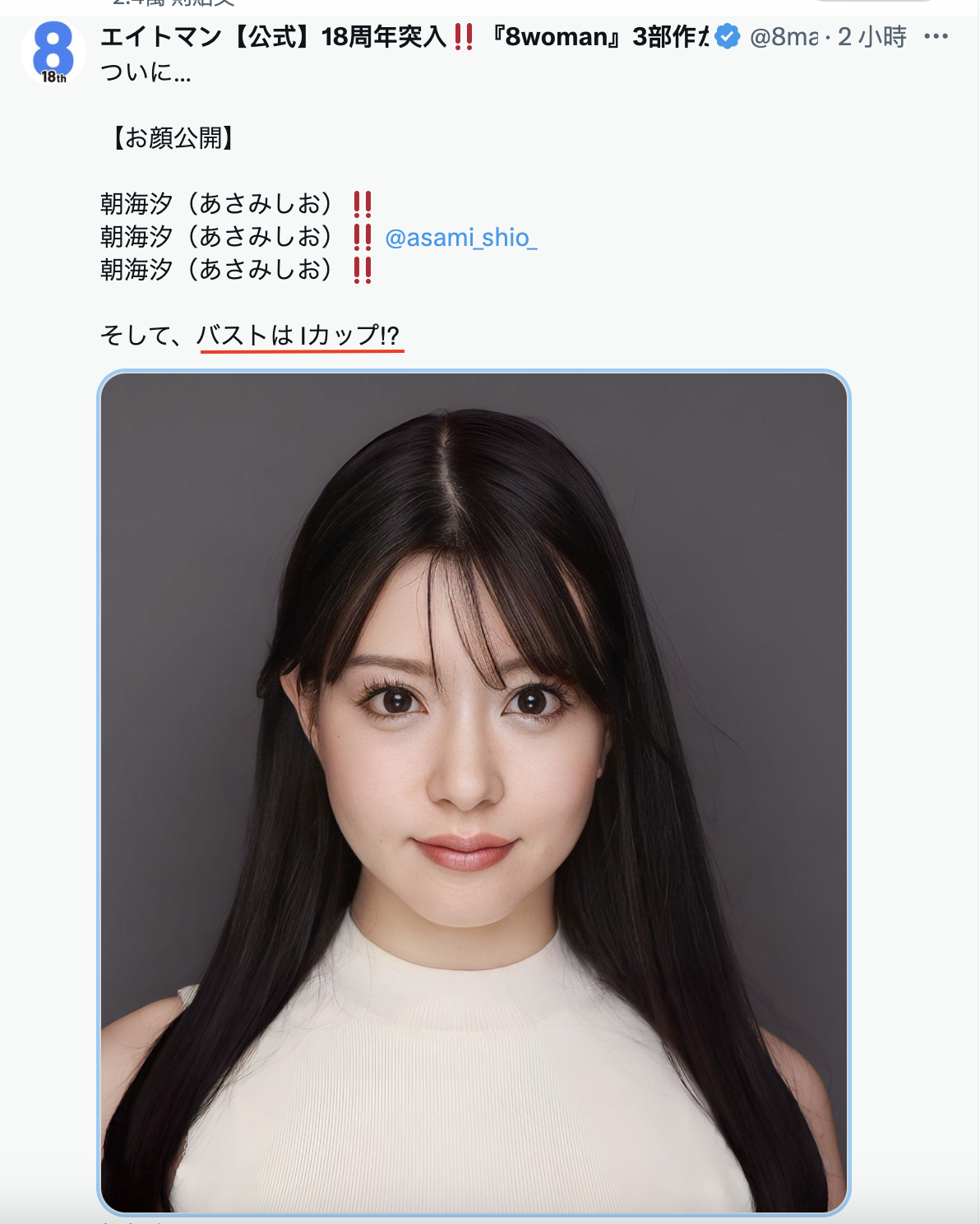 是谁现出庐山真面目呢?是经纪公司エイトマン(8man)的秘密兵器「朝海汐」,我上次说又是海又是汐的这位新人应该很多水,但重点是她脸蛋如何?今天,向来很会行销的经纪公司エイトマン(8man)终于公布真相了: