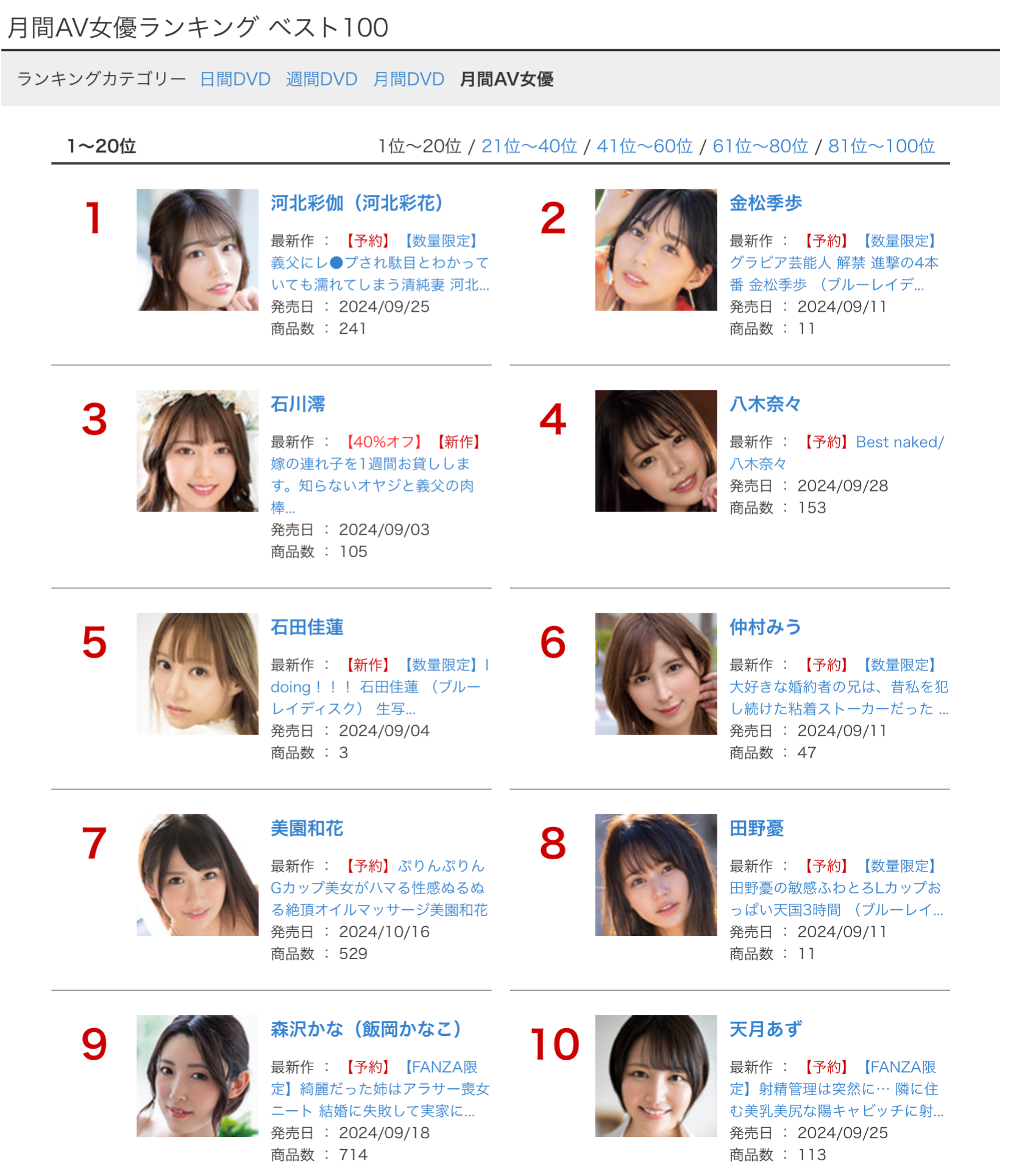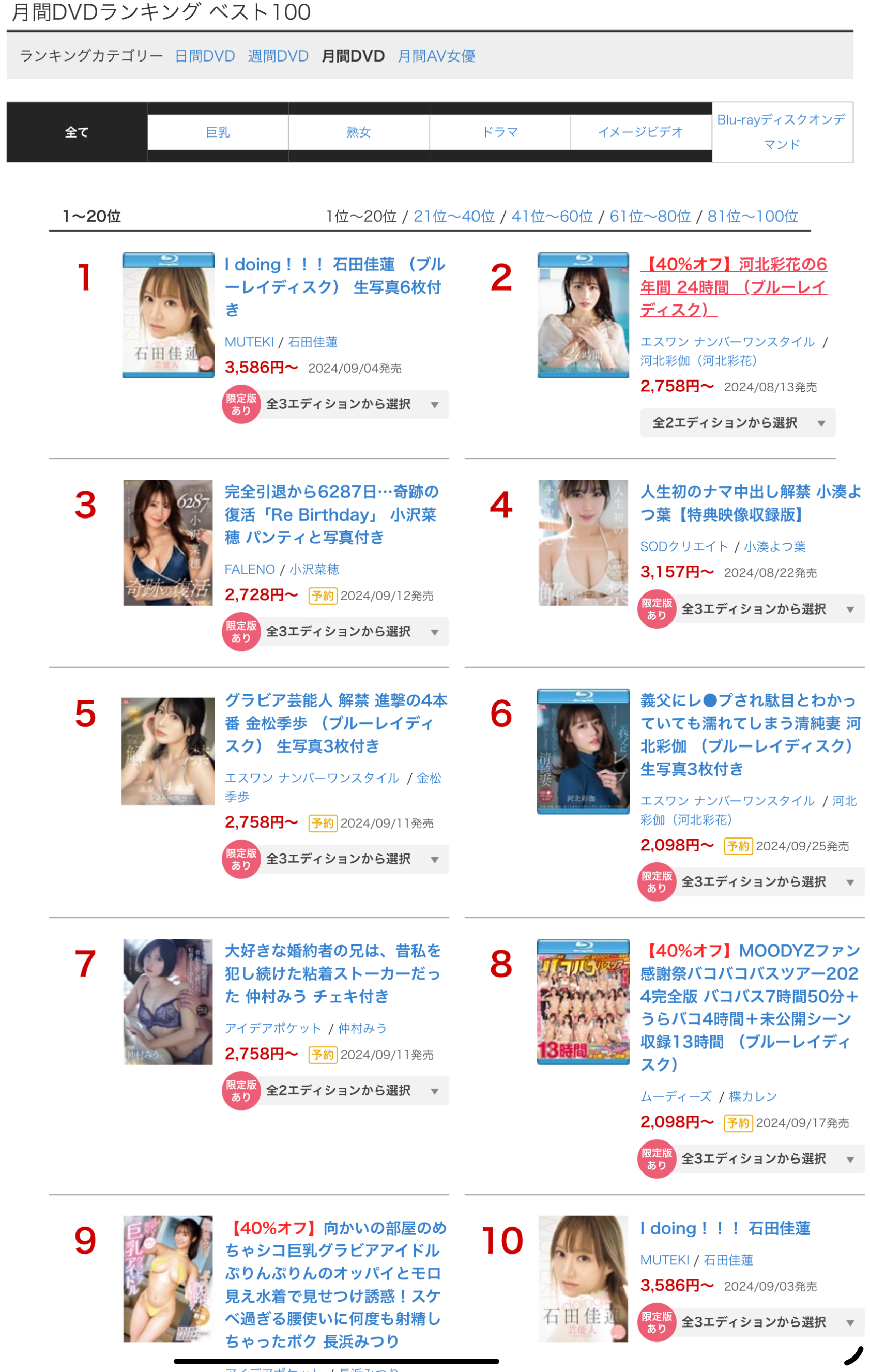 也就是因为这个打六折的动作,让出道以来表现超优秀的「田野忧」掉出十名外,我认为这是非战之罪,她还是非常强大,只可惜这次比价格比CP值稍嫌不足,让片商Moodyz的「MOODYZファン感谢祭バコバコバスツアー2024完全版バコバス7时间50分+うらバコ4时间+未公开シーン收录13时间」挤进了前十名ー从标题就可知道,Moodyz是把本编的感谢祭加上由浜崎真绪等女优演出的番外篇以及未公开的画面综合起来发售了一支总共13小时的完全体感谢祭,在女优人数众多片子分量又大然后还打六折促销的情况下自然很好卖⋯
