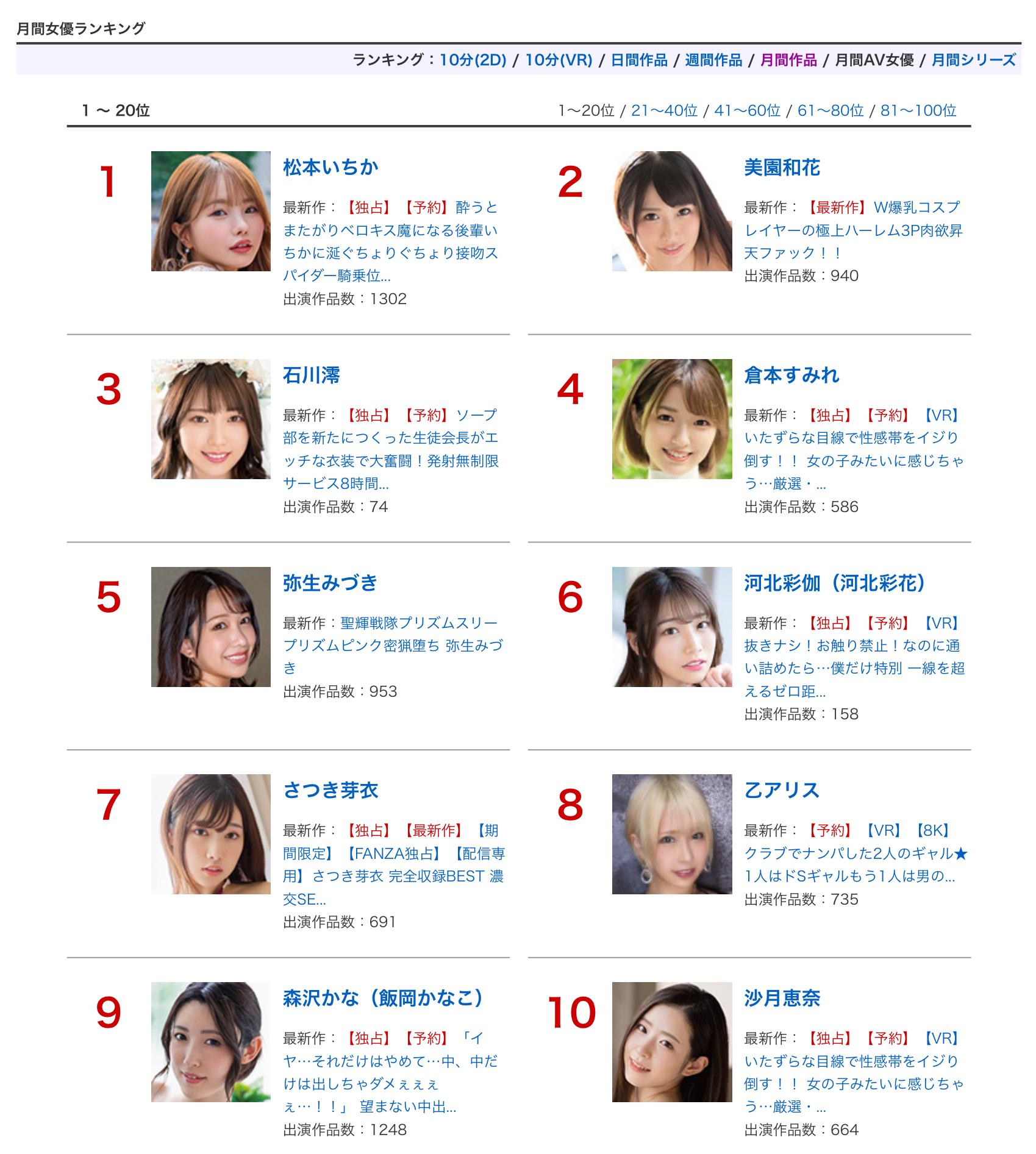 然后这次累积销售的AV女优排行前十名有三位企划女优进榜,分别是「美园和花」、「森沢かな(森泽佳奈)」以及「天月あず(天月杏)」,这也说明了这三位就是当今市场最优秀的企划女优ー不过到了串流平台上这三位女优仍然都不是「松本いちか(松本一香)」的对手,我的天啊,松本小可爱都已经转专属女优多久了依旧在FANZA的串流平台称霸,我觉得也不是其他女优不争气啦,而是之前累积的资本太雄厚了~