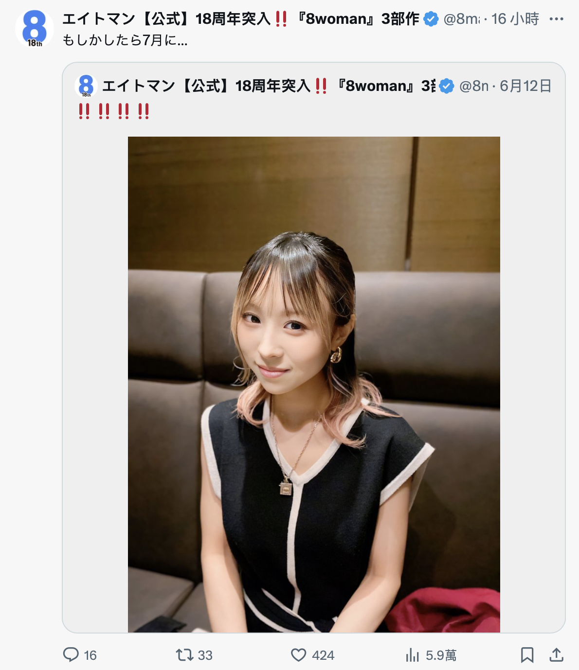 从这两位女优大概就可以知道エイトマン(8MAN)的问题所在,一般经纪公司在预告超级新人出道或是资深战将回归时多半不会让大家等太久的时间,但这家经纪公司只要有一点点进展就急着报告给大家知道,偏偏AV女优不确定性有够高,所以大家不只看到消息要等很久而且这家经纪公司还会漏气给大家看: