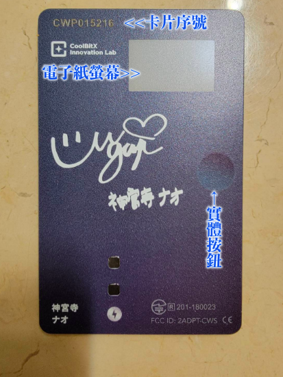 一共有五种不同的包装,分别对应VIP、GRAND、GODDESS、PRECIOUS以及CLASSIC的版本,裡面有一张信用卡大小,製作非常精美的卡片,正面是库币科技重金聘请日本知名摄影师為神宫寺拍摄的写真美照,背面的左上角则会是卡片序号(因為这是试做品所以没有用)、右上方是电子纸萤幕,中间偏右的那个圆圈则是实体按钮⋯