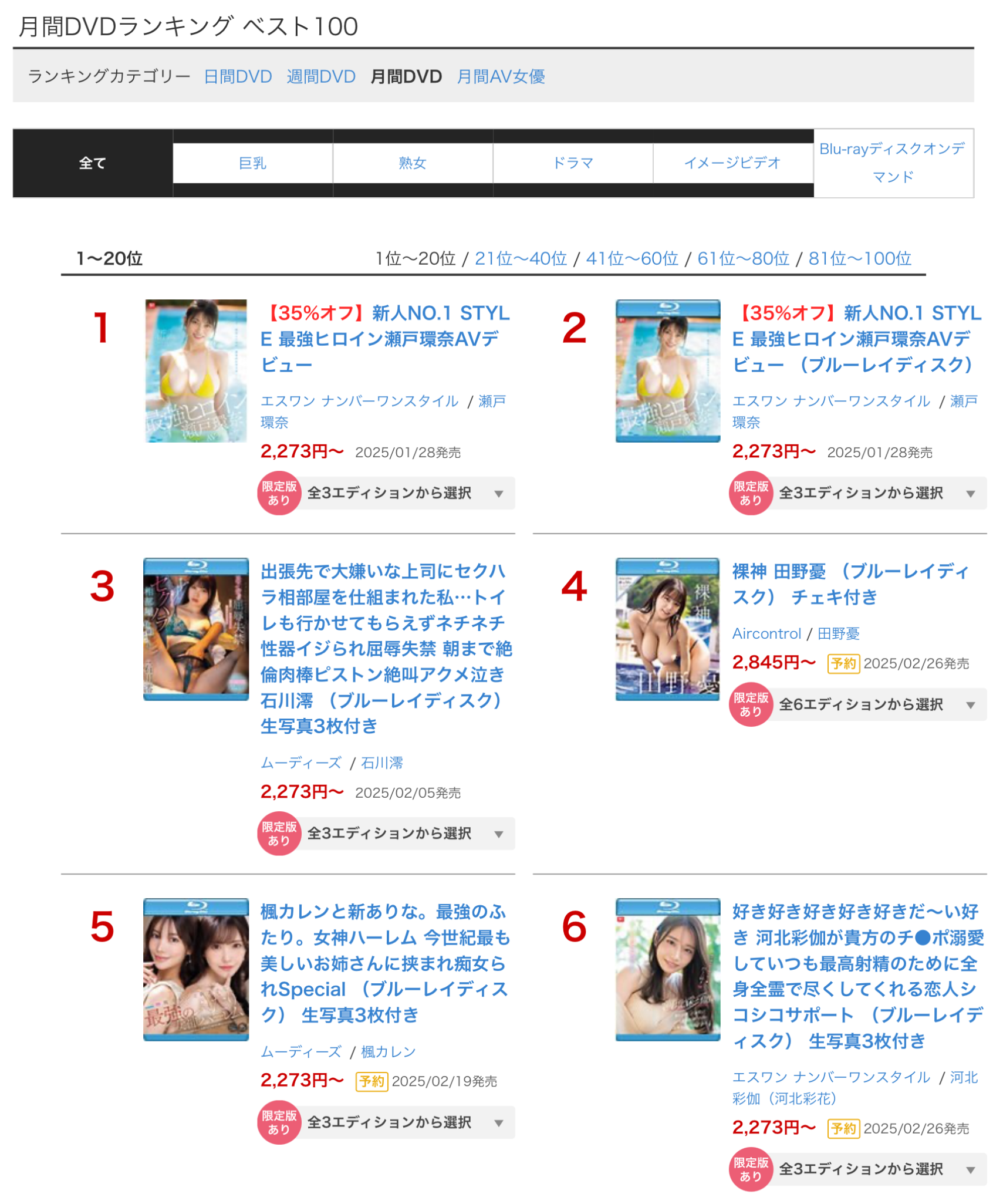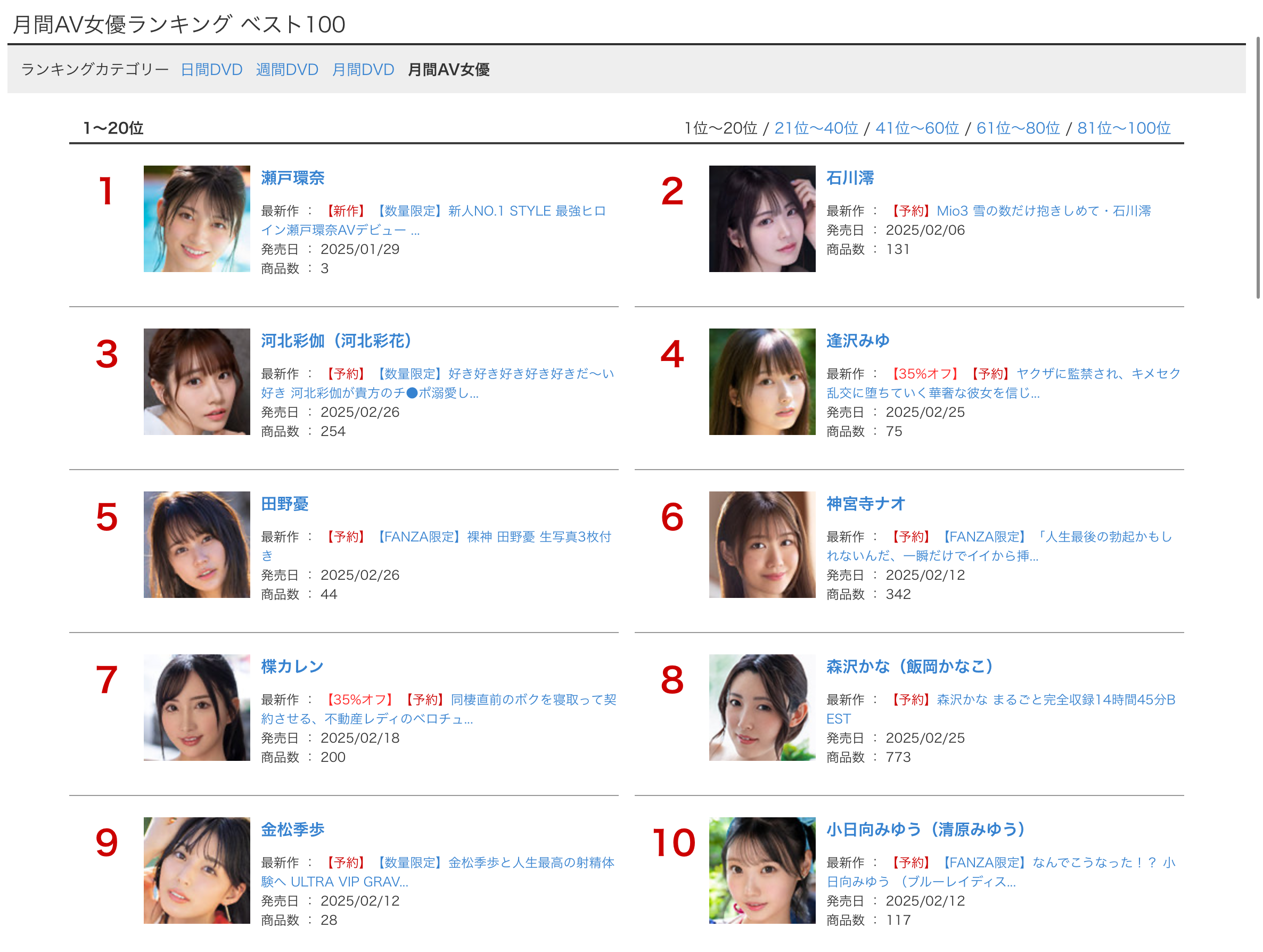 为什么要问这个呢?因为她2月没有新片,也就是没有可以预约的作品,只有已经上市的出道作可以购买,所以从排行榜就可以知道她出道作的成绩如何、重回发片行列的「河北彩伽」有没有拿下冠军宝座?
