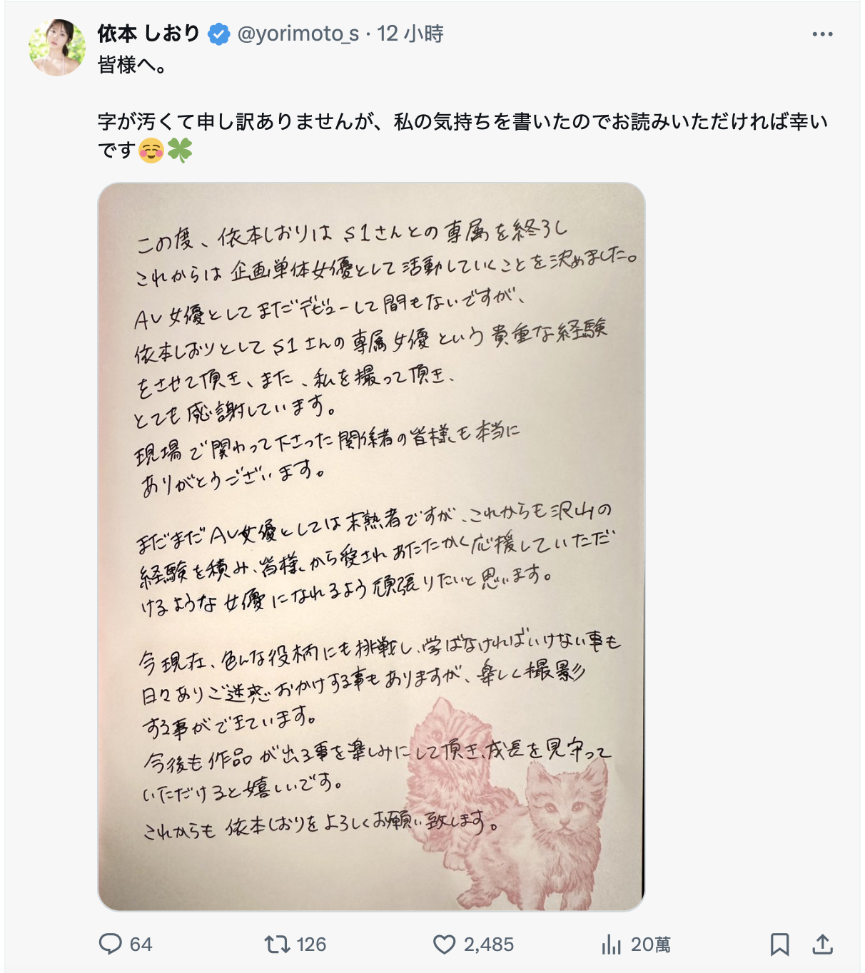 依本しおり(依本诗织)是在X(https://x.com/yorimoto_s)上宣布自己在S1的旅程结束了,之后将以企划女优的身分继续在这行打拼所以不用问了,依本しおり(依本诗织)不会出现在S1的发片清单了,下一次见面,大概就是在某片商中出し解禁引发〜