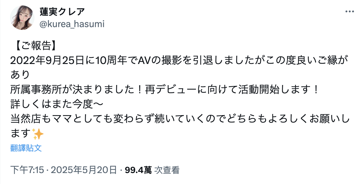 这样讲就不用怀疑了,莲実クレア(莲实克蕾儿)的新事务所就是AV界的经纪公司,而她的「再出道」以及「展开活动」说的也是AV女优的工作,虽然目前没有办法和大家讲清楚,不过有两件事是确定的: