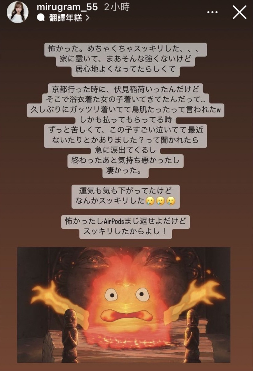 首先miru说了,家里有鬼,不是很强的那种,好像是待在这儿(miru她家)很舒服的样子,让她晚上都睡不好;去京都的时候有到伏见稻荷神社参拜,结果被一个穿着浴衣的女孩(也是鬼)缠上了,对方还说好久没有看到可以跟得那么紧的人了,顿时让她鸡皮疙瘩都起来了⋯