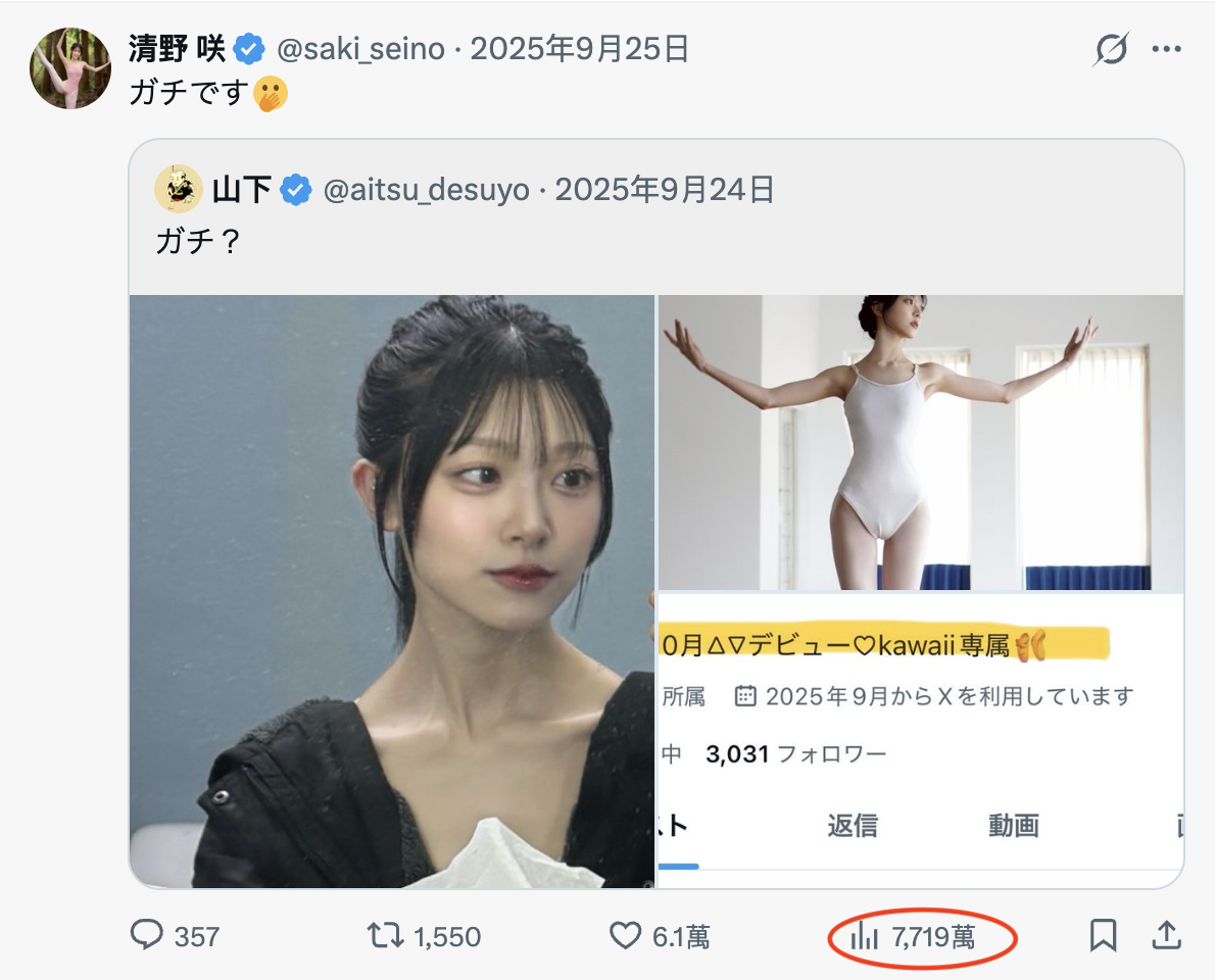 不是发片出了问题,而是她拍A片的事曝光了:去年年底,如果你还记得,她因为芭蕾舞步被很多人批评资历造假导致社群炎上,不只单篇发文流量来到了惊人的7700多万,当日更是创造了比日本人口还多的1.3亿触及—如此巨大的流量不只让她一下子就有了很多追踪也让她出道作卖得相当不错,但没多久,副作用就出现了: